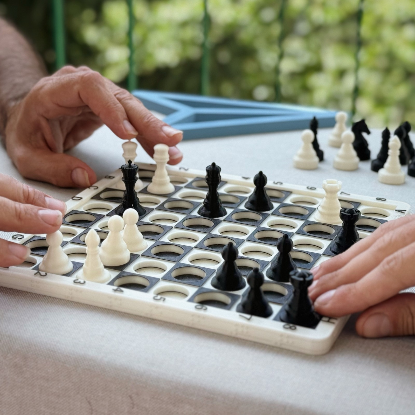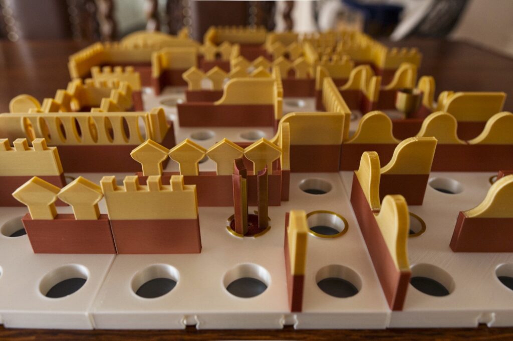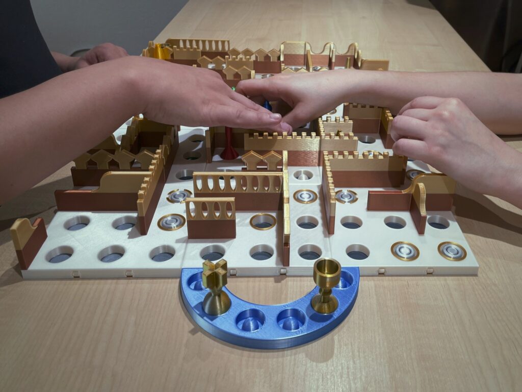 To jeden z naszych największych projektów wykorzystujących druk 3D. Wraz z Karoliną Glanowską, absolwentką Akademii Sztuk Pięknych w Katowicach, zaprojektowaliśmy wciągającą grę dla osób widzących i niewidomych, polegającą na zdobywaniu unikalnych przedmiotów i przechytrzaniu przeciwników, a to wszystko – w całkowitej ciemności. Ze względu na unikatowo zaprojektowaną planszę składającą się z aż dwunastu segmentów, każda rozgrywka jest niepowtarzalna.